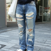 フロント部分が大胆にダメージ加工されたジーンズ。黒アウター+...