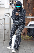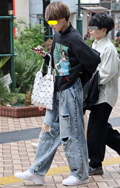 ボロボロに穴が空いたパーカーに赤錆っぽいジーンズの組み合わせ...