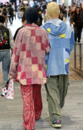 パッチワークがお揃いの2人組。スマイリーが散りばめられたデニ...