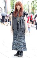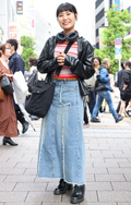 カットオフのジーンズとデニムスカートをレイヤードした上級者感...