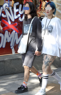 全身黒&全身白のカップル。ロンTにショーツ、スニーカーとシン...