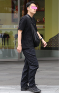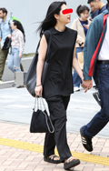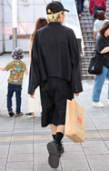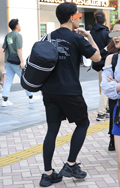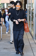 黒いシャツに黒いパンツ、黒いミニバッグでコンパクトなBKルッ...