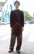 黒いロングTシャツとたっぷりしたシルエットのパンツ、レザー調...