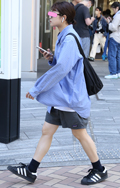 オーバーサイズの長袖シャツにショーツという少年のようなスタイ...