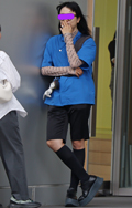 ブルーの超ショート丈シャツにプラダのパース付きベルトチェーン...