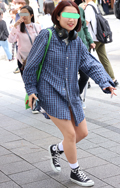 チェック柄のシャツをミニワンピっぽく着こなした女性。シャツの...