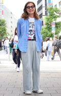 身幅の広い大きめのブルーシャツをラフに着るスタイルが女性にも...