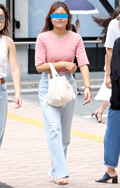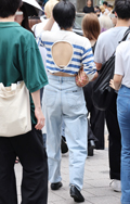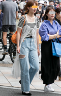 マルチカラーのボーダー柄トップスも人気。ローウエスト気味のカ...