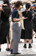 今夏大流行している黒のマキシ丈ワンピース。ボーダーのトップス...