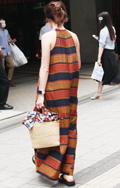 レトロなマルチボーダーのマキシ丈ワンピースとカゴバックでリゾ...