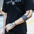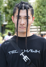 夏でTシャツが欲しくなって買いました。自分はテックやヒップホップ、ラグジュアリーストリートの系統が好きなので、そのノリでこのTシャツを選びました。黒を選んだ理由は自分のスタイルに合うからですねいちばん自分の雰囲気に合ってしっくりくるというか。服飾の専門学校に通っていた時に授業でカラー診断があったんですけど、先生に黒が似合うと言われてよりいっそう黒に対する安心感を覚えました。