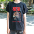 A 夏場はTシャツだけになるのでデザインが効いているものが欲しかったんです。黒系のバンTはたくさん持っています。バンTは褪せているので真っ黒のものが欲しくて。他には古着のスラックスと合わせます。今日は古着のときよりはきれいめな着こなしです。袖が短めなので気に入っています。普段はタックインすることが多いので丈の長さは問題ありません。