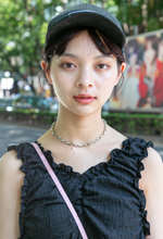 シューズはバレエシューズみたいな感じ。素足では履かず基本は靴下と合わせたり、ミニスカートなどスカート系と合わせています。今年の夏は1番履いています。今日は黒でまとめたくて選びました。ワンピースは暑いから選びました。何着か黒系のワンピースを持っています。もともとは色ものが多かったんですけれど、20歳を過ぎて3年前くらいから大人めな黒をよく着るようになりました。でも色みをひとつ入れるのがマイルールです。今日の色担当はピンクのバッグ。