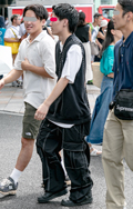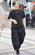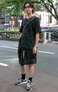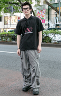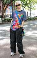 クラッシュTシャツに黒のシンプルなカーゴパンツ、個性派のボリ...