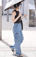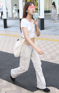 白のカーゴデザインパンツも大人気。デザインヒールのブーツやミ...