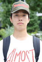 A 父親から「いらないからはく?」みたいな感じでもらいました。父は以前郡山でヒップホップショップのアパレルショップをやってたんです。最近、今日のsicko(シッコ)の迷彩のキャップを買ったのでそれに合わせて着てきました。今日はミリタリー系の色味で帽子とTシャツで差し色の赤を合わせました。普段トップスはシンプルに白か黒で、パンツとか帽子で遊ぶファッションが多いです。
