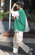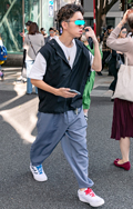 鮮やかなグリーンが目を引いたベストルックの男性。シルエットは...