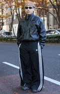 ニードルズのトラックパンツをレザージャケットとレザーシューズ...