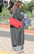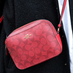 今冬増えそうな赤いスクエアバッグの女性。差し色としてバッグや...