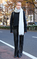 カラーバッグを差し色にしたコーディネートは秋冬ならでは。スク...
