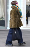 ちょっとレトロな印象のボアのアウターにはポップな色合いのマフ...