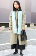ボトムスの色と合わせた明るい色のウィンディー巻きマフラーで華...