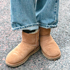 このムートンブーツは2018年当時も流行っていてかわいいと思いました。旦那さんとお揃いで買いました(旦那さんはネイビー)。また履き出したのはインスタを見ていて履いている人が増えたのを感じたから。ジャケットなどのキレイめアイテムにUGG(アグ)のブーツを合わせるコーデの海外の人とか。デニム合わせとか、韓国風にミニスカートに白のソックスを少し見せて履いたり、スラックスにも合わせます。韓国ファッションやメイクに興味があるので。2〜3年前は若いかなと思っていたけどこの着こなしなら自分の歳でもいけるかなと思いました。実際着回しがききます。