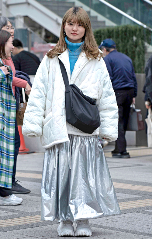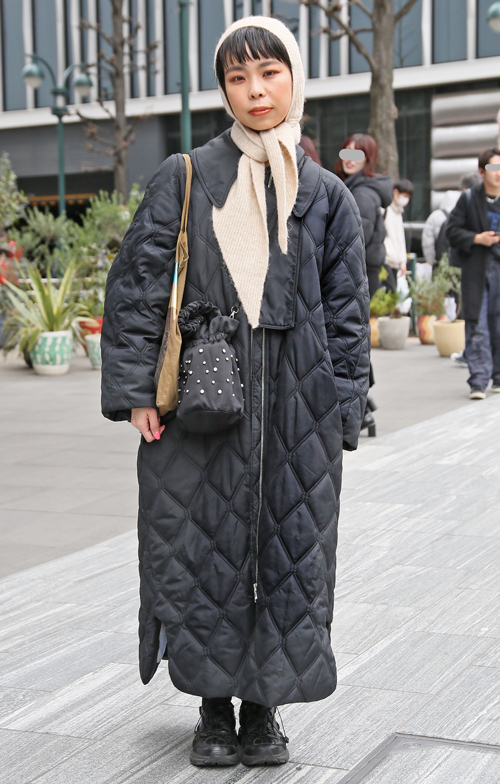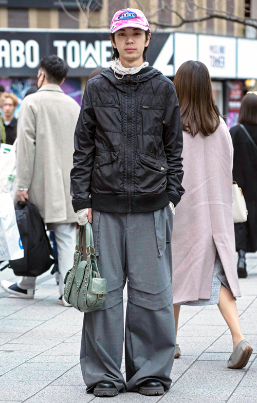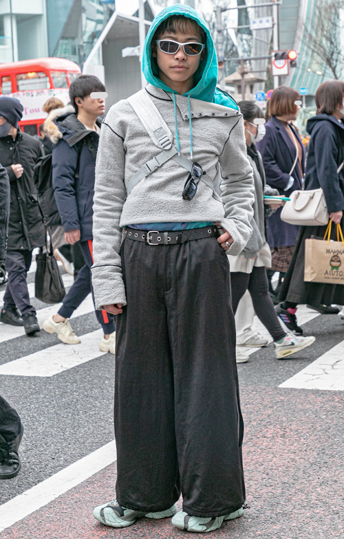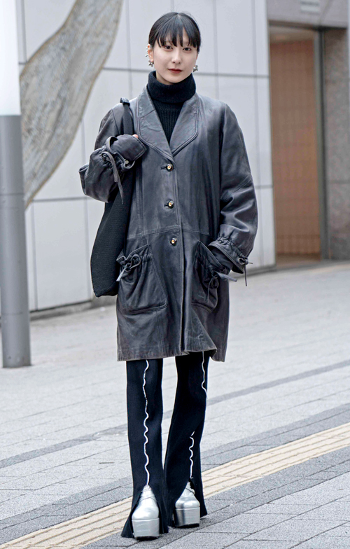 トレンドの太パンツを受け止めるのは負けないボリュームの厚底靴。