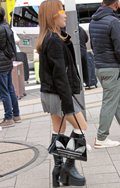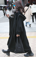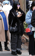 ギャザーたっぷりのフェミニンなトップスをオールブラックコーデ...