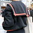 スタジャンが欲しくて。新しい学校のリーダーズが好きで、演者に似ているセーラーカラーで、ライブに行くときにも着れて、普段使いできるものを探していました。これはヤフオクで見つけて即買いしたもので、単純に色、特にボタンの朱色が気に入っています。