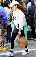レザータッチの比較的身体にピタッとしたパンツをはく女性も増え...