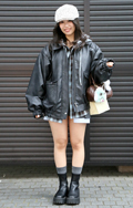レザータッチのブルゾンにショート丈ボトムス、レースアップブー...