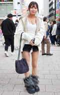 ファーブーツにレッグウォーマーを重ねてボリュームたっぷりの足...
