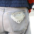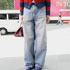 ピンクの加工がされているデニムは珍しいし、かなり太いシルエットが気に入って購入しました。青と赤のトップスの色をひろうことを考えてこのデニムを選びました。