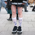このタイツを買ったのはデザインが好みだったから。青が好きで、デザインが青だったので。他にレッグウェアはデニムのレッグウォーマー、お気に入りのを持っています。ブランドはkotohayokozawa(コトハヨコザワ)で、めちゃめちゃ履いています。あとレッグウォーマーの他に履くのはブーツとかです。レッグウォーマーは結構好きで、履き始めたのは大学生くらいの頃なので5年前くらいからになります。全部で5〜6個持っています。その頃から服が好きだったんですけど、人と違うのが好きで、その当時レッグウォーマーを履いている人がいなかったので。何かを見て買うというよりは影響されることはないです。服を自分で買い始めた高校生の頃は奇抜なのは着ていなかったです。周りに合わせていたのかもしれないです。今日このタイツを選んだのはポイントを入れたいというのがあったと思います。無地のソックスとかだったら無難になっちゃうけどこれならアクセントになるので。