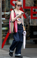 腰の位置よりも下につけたオーバーベルトでローライズ風に見せた...