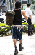 遊び心のあるシュプリームの柄デニムショーツを上品なベルトと白...