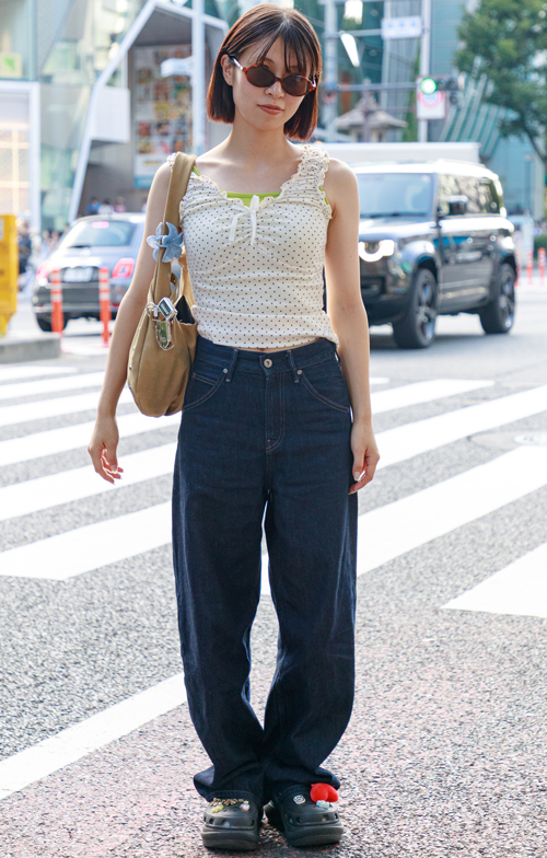 キャミソールやVネック、オフショルダー等、鎖骨まわりが露出するトップスが増加中。