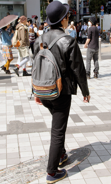 レザーブルゾンにスリムパンツ、ゴツめのレザーシューズにリュッ...
