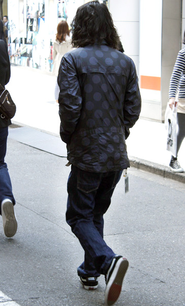 ドット柄のウィンドブレーカーにインディゴのデニム、スニーカー...