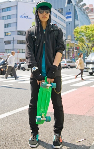 原宿ではスケボーをしそうなストリート系の男性に全身黒コーディ...