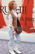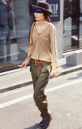 フェミニンなトップスも足元はごつめのワークブーツを合わせる。...