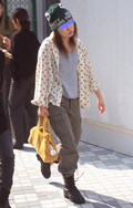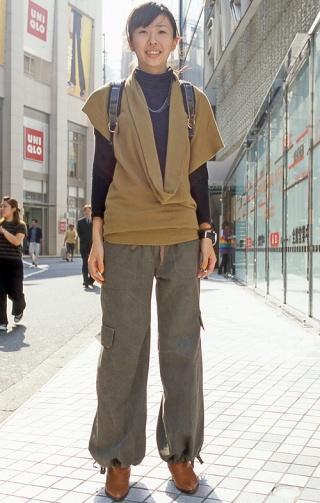 カーディガンを肩に巻いたスタイル。脱いだものを身体に巻くのは...