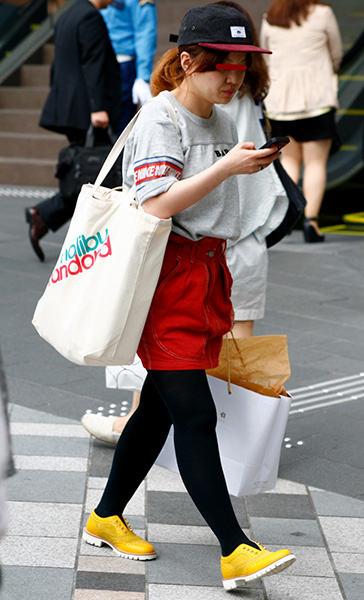 ギャル系に人気だったのがストライプのタイトミニスカート。スニ...