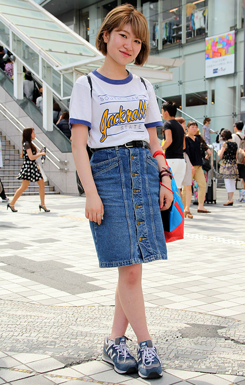 トップスの前見ごろが腰骨よりも短いものを着用している女性すべて。また、トップスをボトムスにinしてウエストラインが腰骨より上になっている場合も含む。色やデザイン、素材は問わない。