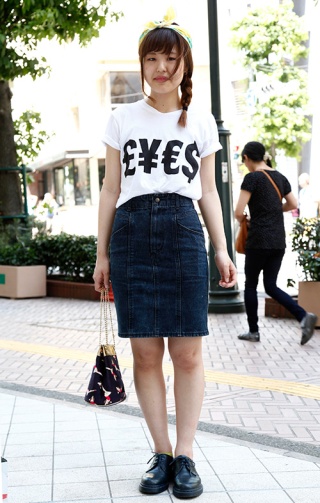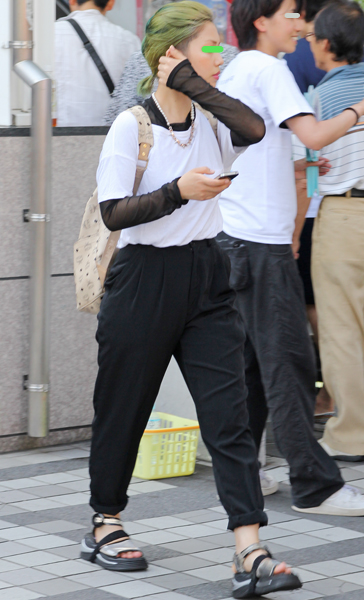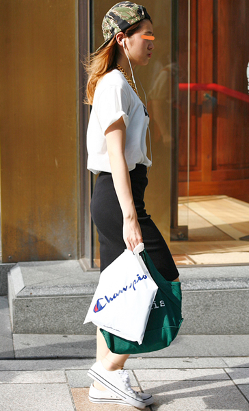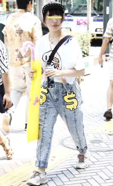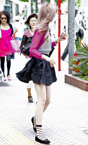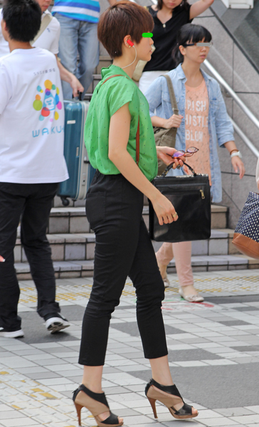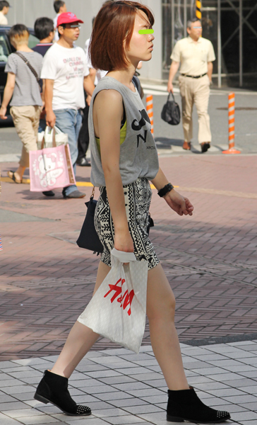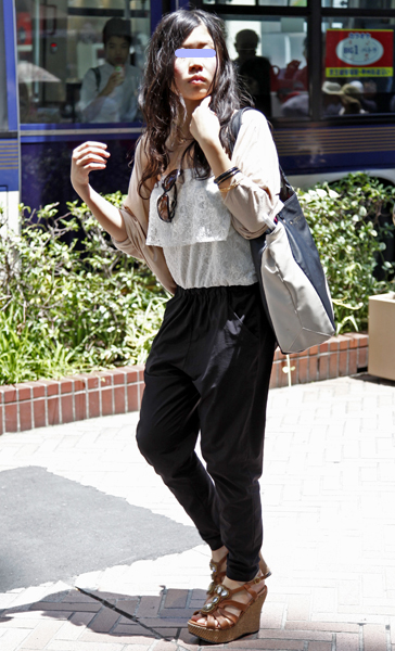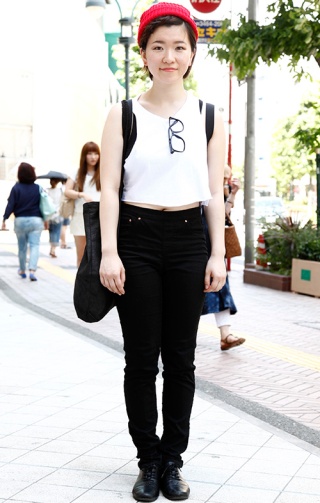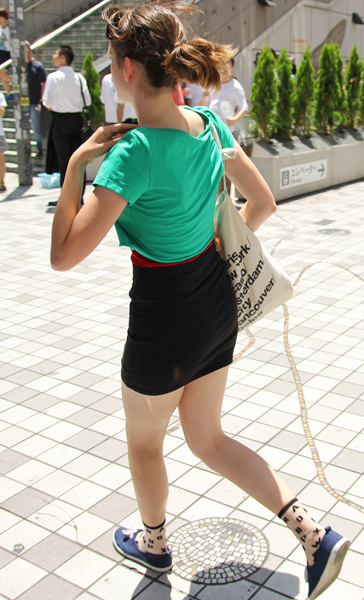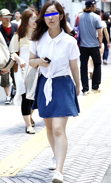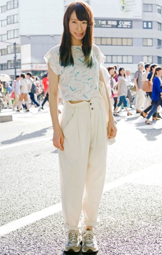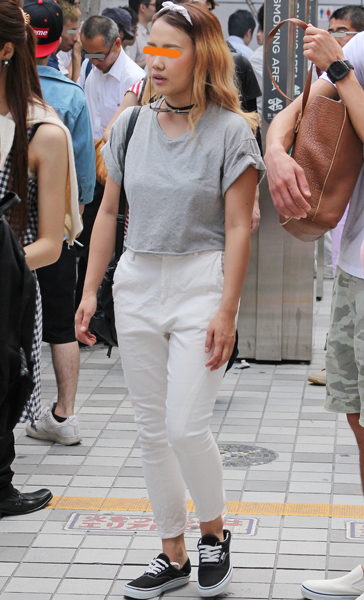 トップスの前見ごろが腰骨よりも短いものを着用している女性すべて。また、トップスをボトムスにinしてウエストラインが腰骨より上になっている場合も含む。色やデザイン、素材は問わない。