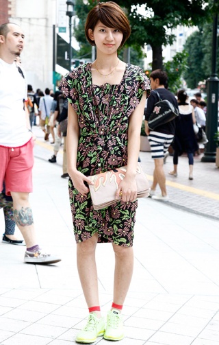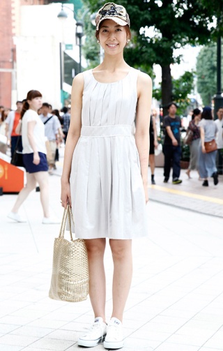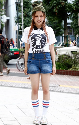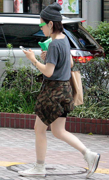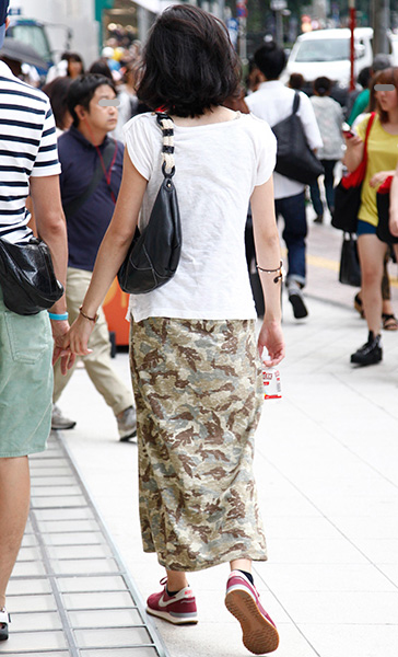 Tシャツ+スカートのシンプルな着こなしだが、迷彩のスカートが...