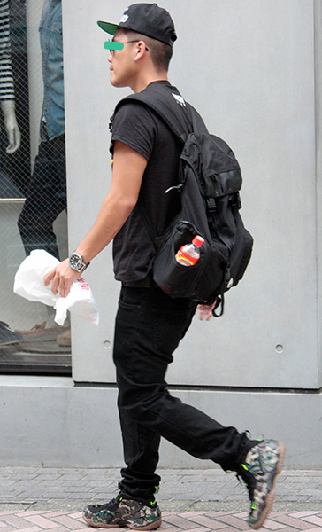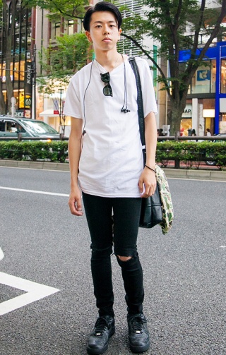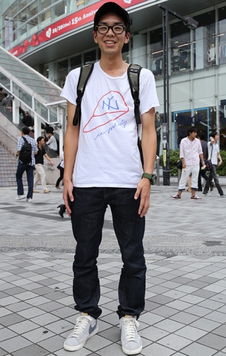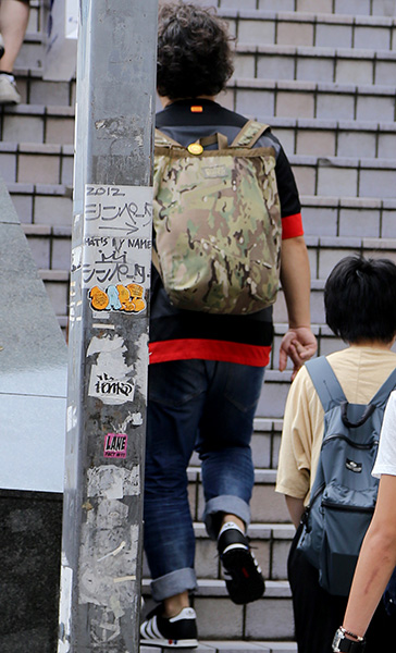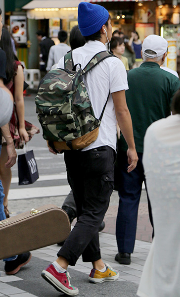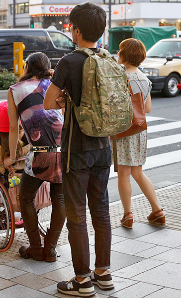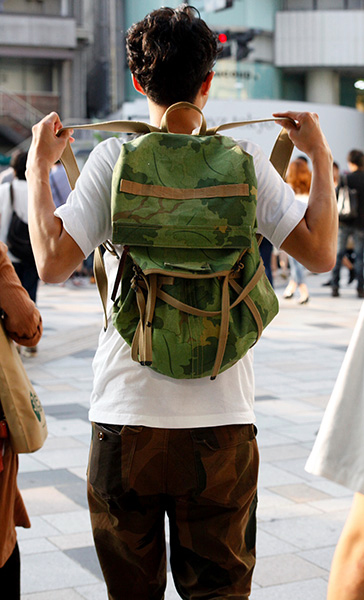 ベーシックなアイテムに迷彩柄のリュックを合わせて脱・シンプル...