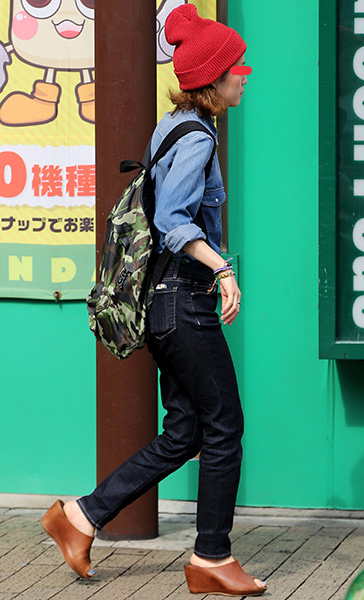 ストリート感が演出できる迷彩のリュック。ニット帽+シャツ+ロ...
