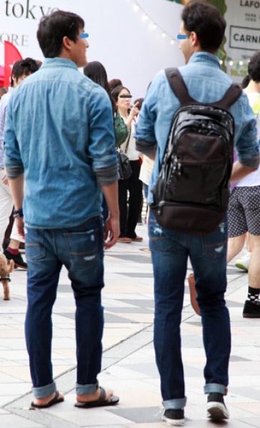 上下デニムのお揃いのスタイルの2人組。今季「DIESEL」な...
